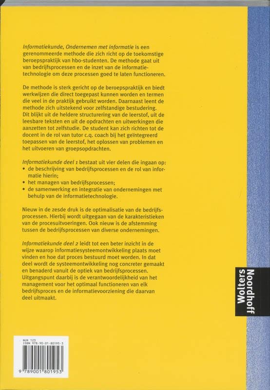 Informatiekunde 1 bestaat uit vier delen. Deel 1 beschrijft bedrijfsprocessen en de rol van informatie hierin. In deel 2 wordt deze rol nader uitgewerkt, in deze herziening aangevuld met het optimaliseren van bedrijfsprocessen. Hierbij wordt uitgegaan van de karakteristieken van de procesuitvoeringen. Deel 3 behandelt het managen van bedrijfsprocessen en de samenwerking en integratie van ondernemingen met behulp van de informatietechnologie. Deel 4 gaat over grenzeloos ondernemen, over ondernemen in de digitale economie. Dit deel is uitgebreid met een hoofdstuk over keteninformatisering. |