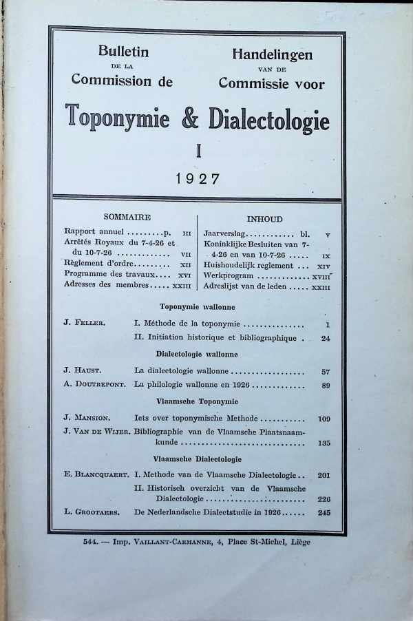 De Handelingen van de Koninklijke Commissie voor Toponymie en Dialectologie – Bulletin de la Commission Royale de Toponymie et Dialectologie worden uitgegeven door de Koninklijke Commissie voor Toponymie en Dialectologie, die haar wetenschappelijke taak uitvoert onder het hoge beschermheerschap van de Koninklijke Vlaamse Academie van België voor Wetenschappen en Kunsten en de Académie royale des Sciences, des Lettres et des Beaux-Arts de Belgique. Het tijdschrift is opgericht in 1927 en publiceert wetenschappelijke studies over toponymie (zowel plaatsnamen als persoonsnamen) en dialectologie voor zowel Nederlandstalig als Franstalig België. We bezitten het tijdschrift vanaf nr I (1927) tot en met nr XXI (1947) en verder vanaf nr XXV (1951) tot en met nr LXVIII (1996). Deze 65 jaargangen werden op uniforme wijze ingebonden in harde kaften. Drie jaargangen (1948, 1949 en 1950) ontbreken. [Deze omschrijving kan vertaald zijn met AI.] Koninklijke Commissie voor Toponymie en Dialectologie/la Commission Royale de Toponymie et Dialectologie, 1927, Brusel |