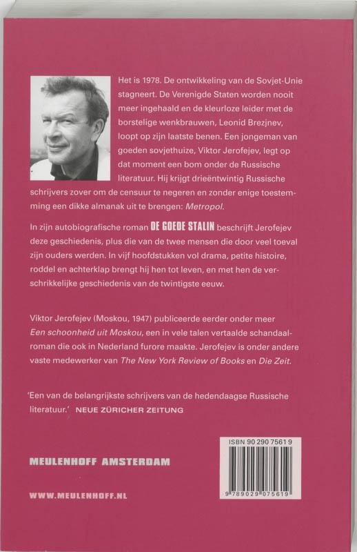 1978. De ontwikkeling van de Sovjet-Unie stagneert. De Verenigde Staten worden nooit meer ingehaald, de kleurloze leider met de borstelige wenkbrauwen Leonid Brezjnev loopt op zijn laatste benen. Haalt de Sovjet-Unie 1984? Het is een jongeman van goeden sovjethuize, Viktor Jerofejev, die op dat moment een bom legt onder de Russische literatuur. Hij krijgt drieëntwintig Russische schrijvers zover om de censuur te negeren en zonder enige toestemming een dikke almanak uit te brengen: Metropolj.In zijn autobiografische roman De goede Stalin ontleedt Jerofejev deze geschiedenis, plus die van de twee mensen die door veel toeval zijn ouders werden. In vijf hoofdstukken vol drama, petite histoire, roddel en achterklap, brengt hij hen tot leven, en met hen de verschrikkelijke geschiedenis van de twintigste eeuw.Het grote drama in het boek is dat de heldendaad van de zoon de vader op klassieke wijze ten val brengt. Zijn vader verliest zijn post als diplomaat in Wenen als hij zijn zoon niet dwingt op diens schreden terug te keren. Dat weigert hij. Eén lijk in de familie is genoeg. Zo vermoordt de zoon uiteindelijk zijn vader, en die heeft daar vrede mee, zonder echter afstand te nemen van Stalin, zijn idool uit de oorlog.