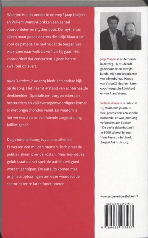 Waarom is alles anders in de zorg? Jaap Maljers en Willem Wansink prikken een aantal vooroordelen en mythes door. De mythe van alleen maar goede dokters die altijd klaarstaan voor de patiënt. De mythe dat de burger niet wil kiezen naar welk ziekenhuis hij gaat. Het vooroordeel dat concurrentie geen betere kwaliteit oplevert.Alles is anders in de zorg biedt een andere kijk op de zorg. Het neemt afstand van achterhaalde denkbeelden. Specialisten, zorgverzekeraars, bestuurders en volksvertegenwoordigers komen er niet ongeschonden vanaf. En waarom is het verkeerd als er een falende zorginstelling failliet gaat?De gezondheidszorg is van ons allemaal. Er werken een miljoen mensen. Toch praat de politiek alleen over de kosten. Maar individueel geluk staat op het spel: de patiënt wil goed worden geholpen. De auteurs komen met originele oplossingen om deze waardevolle sector beter te laten functioneren.Jaap Maljers is ondernemer in de zorg. Hij studeerde geneeskunde en bedrijfskunde. Hij is medeoprichter van adviesbureau Plexus, van VisionClinics (een keten oogchirurgische klinieken) en van Alant Vrouw.Willem Wansink is publicist. Hij studeerde journalistiek, geschiedenis en sociale economie, en was jarenlang verbonden aan Elsevier (De beste ziekenhuizen). In 2008 schreef hij met Hans Feenstra het boek Zo gaat het in de zorg.