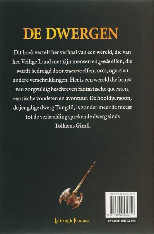 DE DWERGENDit boek vertelt het verhaal van een wereld, die van het Veilige Land met zijn mensen en geode elfin, die wordt bedreigd door zwarte elfin,orcs, ogers en andere verschrikkingen. Het is een wereld die bruist van zorgvuldig beschreven fantastische queesten, exotische vondsten en avontuur. De hoofdpersoon, de jeugdige dwerg Tungdil, is zonder meer de meest tot de verbeelding sprekende dwerg sinds Tolkiens Gimli.