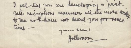 Stationery with pre-printed London address. 41 lines. Folded and creased, edge tears, some staple rust. Holbrook Jackson (1874-1948) was a journalist and a great bibliophile, and wrote many books about books. This is probably about his 1946 'The Reading of Books': it contains a few errors. 'My dear Dan' or Daniel let him know and this funny letter thanks him for it. 'I have felt like a managery-lion in a den of forest-based Daniels (it ought to be geoffries!) each with the aspect of a reviewer of books licking his chops at the chance of a short-list to discomfort an already deflated author.' Fortunately, a second edition appeared in 1947 with improvements. Jackson praises Daniel for 'your broadcast on American Books', which is better than the others that had been heard on 'the Third Programme' up to that time. This BBC cultural channel had only been on the air since 29 September 1946. Jackson's handwriting is beautiful but does not reveal itself easily - sleuths who enjoy puzzling and deciphering can have a field day with this letter. Daniel Bunting (1890-1967) worked a.o. as a reader for Jonathan Cape. He published several collections of essays under the pseudonym Daniel George.