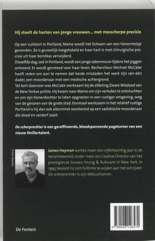 Messcherpe debuutthriller over een hartendief pur sang… Op een avond in september wordt het lichaam van een tienermeisje gevonden in een steegje in Portland, Maine. Ze is gruwelijk toegetakeld en haar hart is met chirurgische precisie uit haar borstkas verwijderd. Diezelfde dag, ook in Portland, wordt een jonge zakenvrouw tijdens het joggen ontvoerd. Er wordt gevreesd voor haar leven. Rechercheur Michael McCabe heeft reden om aan te nemen dat beide misdaden het werk zijn van één dader, een moordenaar met een medische achtergrond. Tot kort daarvoor was McCabe werkzaam bij de afdeling Zware Misdaad van de New Yorkse politie. Hij kwam naar Maine om zijn verleden te ontvluchten en om zijn tienerdochter te laten opgroeien in een rustiger omgeving, weg van de gevaren van de grote stad. Eenmaal werkzaam in het relatief rustige Maine is hij dan ook allerminst voorbereid op een afschrikwekkende moordenaar die dood en verderf zaait. Net wanneer zijn ex-vrouw opeens de voogdij over hun dochter opeist, moet McCabe alles op alles zetten om de vermiste vrouw te vinden en de sadistische moordenaar te ontmaskeren voordat die opnieuw toeslaat… De scherprechter is een geraffineerde, bloedspannende pageturner van een nieuw thrillertalent. 'Een verbluffend debuut dat me van het begin tot eind bij de lurven greep. Een sensationele thriller!' bestsellerauteur Tess Gerritsen James Hayman werkte al meer dan vijfentwintig jaar in de reclamewereld, onder meer als Creative Director van het prestigieuze bureau Young & Rubicam in New York, voordat hij zich fulltime aan het schrijven besloot te wijden. De scherprechter is zijn debuutroman. |