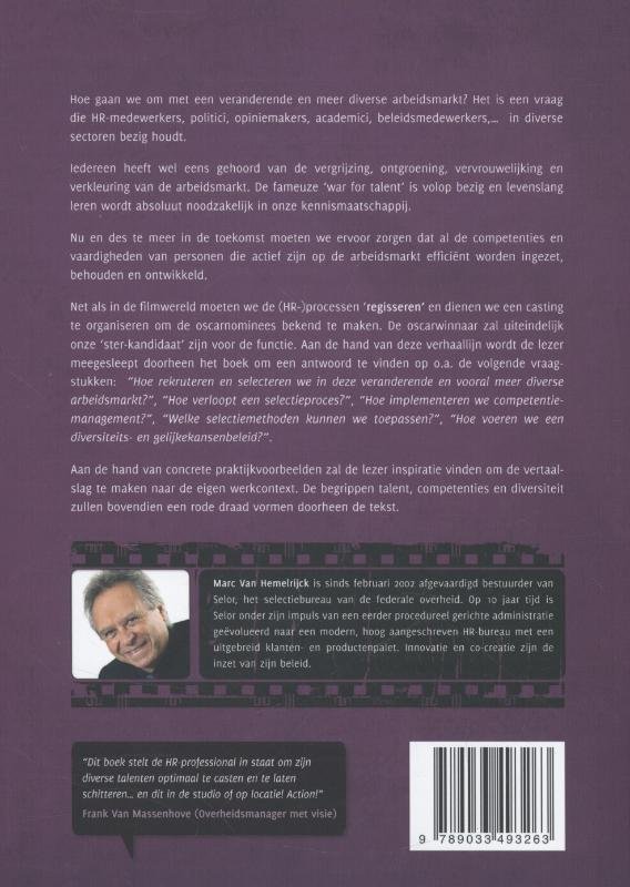 Hoe gaan we om met een veranderende en meer diverse arbeidsmarkt? Het is een vraag die HR- medewerkers, politici, opiniemakers, academici, beleidsmedewerkers,... in diverse sectoren bezig houdt.Iedereen heeft wel eens gehoord van de vergrijzing, ontgroening, vervrouwelijking en verkleuring van de arbeidsmarkt. De fameuze 'war for talent' is volop bezig en levenslang leren wordt absoluut noodzakelijk in onze kennismaatschappij. Nu en des te meer in de toekomst moeten we ervoor zorgen dat al de competenties en vaardigheden van personen die actief zijn op de arbeidsmarkt efficiënt worden ingezet, behouden en ontwikkeld. Net als in de filmwereld moeten we de (HR-)processen 'regisseren' en dienen we een casting te organiseren om de oscarnominees bekend te maken. De oscarwinnaar zal uiteindelijk onze 'ster-kandidaat' zijn voor de functie. Aan de hand van deze verhaallijn wordt de lezer meegesleept doorheen het boek om een antwoord te vinden op o.a. de volgende vraagstukken: "Hoe rekruteren en selecteren we in deze veranderende en vooral meer diverse arbeidsmarkt?", "Hoe verloopt een selectieproces?", "Hoe implementeren we competentiemanagement?", "Welke selectiemethoden kunnen we toepassen?", "Hoe voeren we een diversiteits- en gelijke kansen beleid?". Aan de hand van concrete praktijkvoorbeelden zal de lezer inspiratie vinden om de vertaalslag te maken naar de eigen werkcontext. De begrippen talent, competenties en diversiteit zullen bovendien een rode draad vormen doorheen de tekst.OVER DE AUTEURMarc Van Hemelrijck is sinds februari 2002 afgevaardigd bestuurder van Selor, het selectiebureau van de federale overheid. Op 10 jaar tijd is Selor onder zijn impuls van een eerder procedureel gerichte administratie geëvolueerd naar een modern, hoog aangeschreven HR-bureau met een uitgebreid klanten-en productenpallet. Innovatie en co-creatie zijn de inzet van zijn beleid.