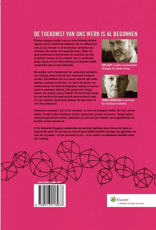 Klanten stappen sneller over op ontwrichtende technologieën dan je bedrijf kan bijbenen. Als ze enthousiast over je zijn, kunnen ze je boodschap versterken op manieren die eerder niet mogelijk waren. Maar als jouw performance tekortschiet ten opzichte van wat je belooft, kunnen zij de controle over je merkboodschap kapen en hun teleurstelling en frustratie sneller verspreiden dan je kunt bijhouden.Om gelijke tred te houden met de connected customers van vandaag moet je bedrijf een connected company worden. Dat betekent dat je je nauw verbindt met medewerkers, partners en klanten. En: dat je de manier verandert waarop het werk wordt gedaan, waarop je succes meet en prestaties beloont. Het vereist een nieuwe manier van denken over je bedrijf. Zie het bedrijf minder als een machine die moet worden gecontroleerd, meer als een complex, dynamisch systeem dat kan leren en zich kan aanpassen.Connected company's zijn in het voordeel: ze leren en bewegen sneller dan hun concurrenten. Terwijl andere bedrijven risico's analyseren, grijpen zij kansen. Terwijl andere bedrijven geïsoleerd werken, verbinden zij zich aan een netwerk van mogelijkheden en breiden zij hun invloed uit.In De Connected Company onderzoeken de auteurs wat deze bedrijven doen, hoe ze het doen en waarom het werkt. En ze laten je zien hoe jouw bedrijf dezelfde principes kan gebruiken om zich aan te passen - en om succesvol te zijn - in de continu veranderende mondiale markt van vandaag.
