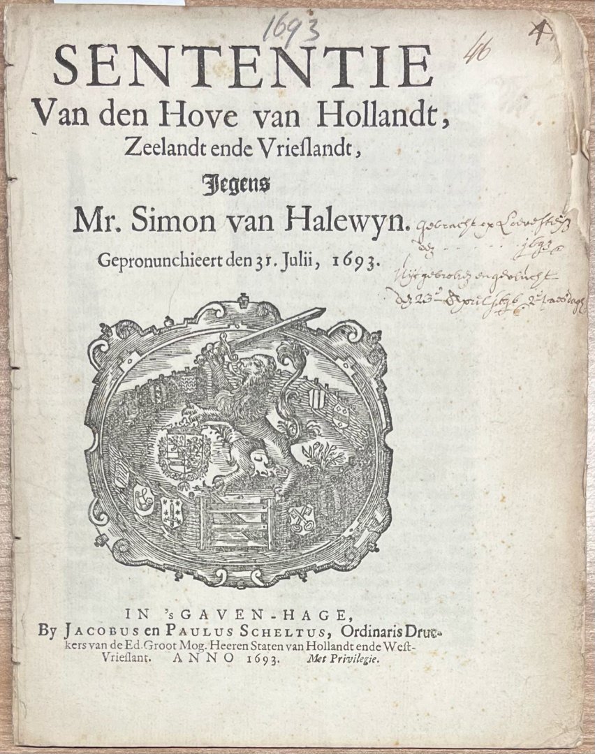 | Titel: | Printed publication, 1693, Halewyn | Sententie Van den Hove van Hollandt, Zeelandt ende Vrieslandt, Jegens Mr. Simon van Halewyn. Gepronunchieert den 31. Julii, 1693. In 's Gaven-hage, By Jacobus en Paulus Scheltus (...) 1693, 8 pp. with privi... |