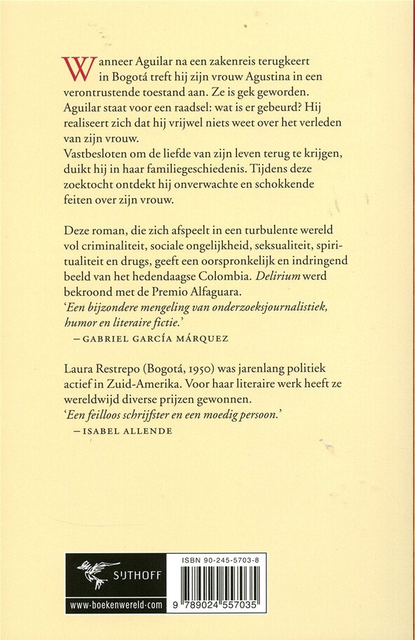 Wanneer Aguilar na een zakenreis terugkeert in Bogot reft hij zijn vrouw Agustina in een verontrustende toestand aan. Ze is gek geworden. Aguilar staat voor een raadsel: wat is er gebeurd? Hij realiseert zich dat hij vrijwel niets weet over het verleden van zijn vrouw.Vastbesloten om de liefde van zijn leven terug re krijgen, duikt hij in haar familiegeschiedenis. Tijdens deze zoektocht ontdekt hij onverwachte en schokkende feiten over zijn vrouw.Deze roman, die zich afspeelt in een turbulente wereld vol criminaliteit, sociale ongelijkheid, seksualiteit, spiritualiteit en drugs, geeft een oorspronkelijk en indringend beeld van het hedendaagse Colombia. Delirium werd bekroond met de Premio Alfaguara.'Een bijzondere mengeling van onderzoeksjournalistiek, humor en literaire fictie.' - GABRIEL GARC M RQUEZLaura Restrepo (Bogot 1950) was jarenlang politiek actief in Zuid-Amerika. Voor haar literaire werk heeft ze wereldwijd diverse prijzen gewonnen.'Een feilloos schrijfster en een moedig persoon.' - ISABEL ALLENDE