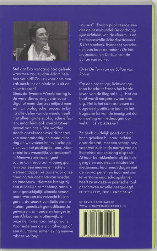 Stel dat Eva vandaag had geleefd, waarmee zou zij dan Adam hebben verleid? Zou zij voor hem een zak met frites en pindasaus uit de muur trekken?Sinds de Tweede Wereldoorlog is de wereldbevolking verdrievoudigd tot meer dan zes miljard mensen. Dit biologische 'succes' in bijna alle delen van de wereld heeft niet alleen grote ecologische effecten, maar leidt ook overal tot een gevoel van crisis. We worden steeds onzekerder over de schaal van modernisering en mondialisering en we vrezen het cynische gezicht van het postkapitalisme. Moet er niet iets wezenlijks veranderen?In Nieuwe spijswetten geeft Louise O. Fresco aanknopingspunten voor een nieuwe ethische en wetenschappelijke basis voor onze houding ten opzichte van voedsel en landbouw. Hiermee brengt zij een duidelijke samenhang aan tussen ogenschijnlijk uiteenlopende onderwerpen als vetzucht bij jongeren, de smaak van Italiaanse tomaten, genetisch gemodificeerde gewassen, armoede en honger in een Afrikaanse krottenwijk, en onze heimwee naar het paradijs. Voor iedereen die zich afvraagt of een duurzame samenleving nieuwe taboes verlangt.Louise O. Fresco publiceerde eerder de essaybundel De ondraaglijke lichtheid van de vleermuis en het succesvolle Schaduwdenkers & Lichtzoekers. Eveneens verschenen van haar de romans De kosmopolieten en De Tuin van de Sultan van Rome.Over De Tuin van de Sultan van Rome:'Op een prachtige, lichtvoetige toon beschrijft Fresco het harde leven van de illegaal (...). Het verhaal wordt nergens zwaarmoedig. Het is het contrast tussen de opgewekt poëtische toon en het tragische lot van de immigrant dat ontroering en mededogen opwekt.'de volkskrant'Ze heeft duidelijk goed om zich heen gekeken bij haar tochten door de stad, met een scherp oog voor wat zich in de marge van de Romeinse samenleving afspeelt. Al haar betrokkenheid bij de hongerige en anderszins misdeelde medemens, haar mededogen met de verworpenen en haar niet mis te verstane maatschappijkritiek heeft ze in deze in poëtische taal geschreven novelle neergelegd.'elsbeth etty, nrc handelsblad