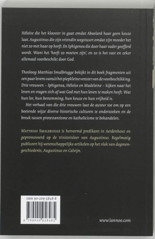 Theoloog Matthias Smalbrugge voert drie vrouwen ten tonele die geconfronteerd worden met ‘voorbestemming’:Héloise, Iphigenea en (de fictieve) Madeleine kijken naar wat God met hun leven voorheeft en in welke mate zij vrijheid hebbenVia deze verhalen krijgt de lezer informatie over thema’s zoals lot, bestemming en vrijheid, maar ook over de breuk tussen katholicisme en protestantismeVerplichte lectuur voor iedereen die beter inzicht wil krijgen in de religieuze dimensie van de historische kloof tussen Noord- en Zuid-Nederland