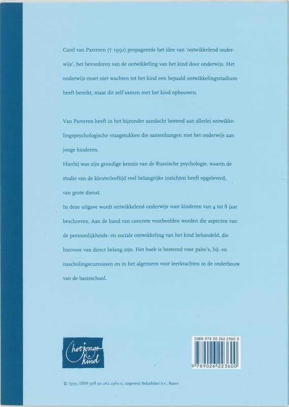 Carel van Parreren propageerde het idee van 'ontwikkelend onderwijs', het bevorderen van de ontwikkeling van het kind door onderwijs. Het onderwijs moet niet wachten tot het kind een bepaald ontwikkelingsstadium heeft bereikt, maar dit samen met het kind opbouwen. Van Parreren heeft in het bijzonder aandacht besteed aan allerlei ontwikkelingspsychologische vraagstukken die samenhangen met het onderwijs aan jonge kinderen. Hierbij was zijn grondige kennis van de Russische psychologie, waarin de studie van de kleuterleeftijd veel belangrijke inzichten heeft opgeleverd, van grote dienst. In deze uitgave wordt ontwikkelend onderwijs voor kinderen van 4 tot 8 jaar beschreven. Aan de hand van concrete voorbeelden worden die aspecten van de persoonlijkheids- en sociale ontwikkeling van het kind behandeld, die hiervoor van direct belang zijn. Het boek is bestemd voor pabo's, bij- en nascholingscursussen en in het algemeen voor leerkrachten in de onderbouw van de basisschool.