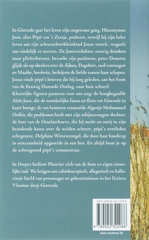In Gistrode gaat het leven zijn ongewone gang. Hieronymus Joos, alias Pépé van ’t Zeetje, probeert, terwijl hij zijn halve leven aan zijn achterachterkleinkind Jonas vertelt, vergeefs om eindelijk te sterven. De Jeneverdokter, eeuwig dronken maar plichtsbewust, bezoekt zijn patiënten, pater Donatus glijdt als op skeelers over de dijken, Dagobert, oud-varensgast en Maaike, herderin, bedrijven de liefde tussen haar schapen. Jonas vindt Pépé’s brieven die hij lang geleden, van aan het front van de Eeuwig Durende Oorlog, naar huis schreef. Kleurrijke figuren komen aan bod: de hoogbegaafde Aloïs Joos, die Gistrodes wonderlijke fauna en flora in kaart brengt; de van heimwee vermoeide AlgerijnMohammed Oufkir, die problemen heeft met zijn schijnzwangere dochter; de heer van de Elewauthoeve, die bij nacht en ontij in zijn brandende karos over de weiden scheert; Pépé’s overleden echtgenote, Delphine Wittewrongel, die door haar handicap in eenzaamheid opgroeide in een bos. En altijd hoor je op de achtergrond Pépé’s commentaar. Aan het einde van het boek schuiven de hoofdstukken in elkaar tot een caleidoscopisch geheel. In Dorpers bedient Plouvier zich van de hem zo eigen zinnelijke taal. In de dialogen wordt consequent een volks idioom gehanteerd. Door gebeurtenissen en dorpers uit te vergroten tot ze net niet karikaturaal worden, confronteert de auteur de lezer met diepmenselijke problemen en zoekt hij naar antwoorden op de vragen die ieder van ons zich wel eens stelt.