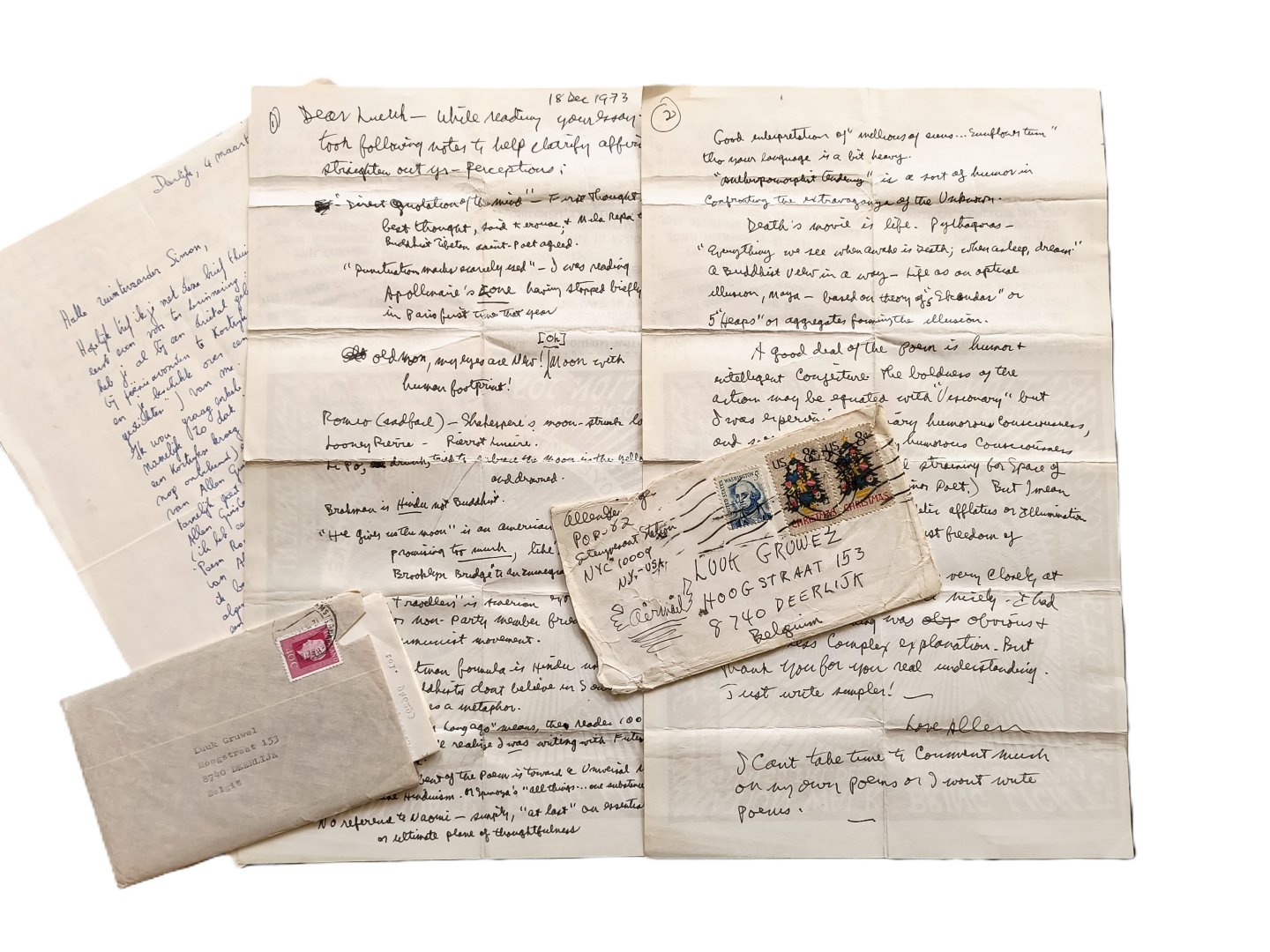 \"Ik heb een vrij uitvoerige ‘analyse’ gemaakt van Poem Rocket, waarover ik onlangs een lange brief van Allen Ginsberg zelf mocht ontvangen.”\n[Collectie met:]\nAllen GINSBERG – Autograph letter signed, to Luuk GRUWEZ - [New York] 18 Dec 1973. 2 handwritten pages, each on verso of a vintage poster “Veterans and Reservists to End the War in Vietnam / New York Workshop in Nonviolence Peace Illumination Walk, 1966“, in original envelop, stamped and send by airmai.\n* Belgian writer and poet Luuk Gruwez (born 9 August 1953) had sent Ginsberg an essay in which he analysed Ginsbergs ‘Poem Rocket‘ (first published in Kaddisj).\nGinsberg’s answer written on verso of posters for an anti-Vietnamwar ‚walk‘ and benefit for action Vietnames children: “Dear Luuk – While reading your essay I took following notes to help clarify affirm of straighten out yr – perceptions; […] Death’s movie is life. Pythagoras – ‚Everything we see when awake is death: when asleep, dream.’ A Buddhist view in a way – Life as an optical illusion, Maya – based on theory of 5 ‚Skandas‘ or 5 ‚Heaps‘ or aggregates forming the illustion. A good deal of the poem is humor & intelligent conjecture. The boldness of the action may be equated with ‘Visionary’ but I was experiencing ordinary humorous consciousness , […] I mean there was nog instant psychedelic afflatus or illumination present during composition. Just freedom of imagination. However your essay looks very closely at the poem & understands it nicely. I had thought the meaning was obvious & needed less complex explanation. But thank you for your real understanding. Just write simpler! – Love Allen / I can’t take time to comment much on my own poems or I wont write poems.”Added: * 2 autograph letters, signed by Luuk Gruwez tot Simon Vinkenoog, (in Dutch) dated ‘Deerlijk, 4 maart / 13 april 1974). Gruwez inquires for documentation on Allen Ginsberg and the Beat generation in general (asking for adresses) in preparation for a reading on Ginsberg, translations and of his poems and a thesis he intends to write: ‘Le poète maudit en de beat-generation’. ** Original typed letter signed from Simon Vinkenoog to Luuk Gruwez (in Dutch), dated: Amsterdam, 17.4.74. 1 p., in the original envelop.