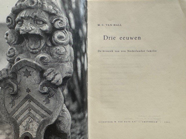 Drie eeuwen. De kroniek van een Nederlandse familie. Amsterdam, Ten Have, 1961, 124pp. original tooled linen binding, family crest of Van Hall family in relief on front, gilt lettering on spine, some damage to binding in isolated places, frontispiece coat of arms of Van Hall famliy photograph, many illustrations in the book, with family tree.
