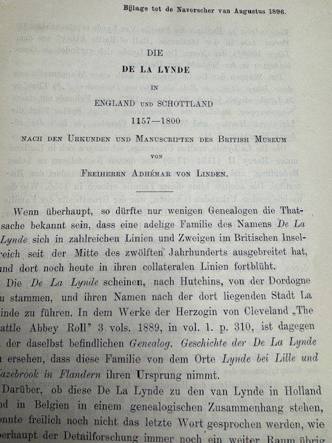Die De La Lynde in England und Schottland 1157-1800 nach den Urkunden und Manuskripten des British Museum van Freiherrn Adhemar von Linden. Extract, bijdrage tot de Navorscher van Augustus 1896, 78pp.uncut, no binding, loose sections, with fold out family tree of De la Lynde of Hartley and of Winterborne Clenston, family tree of De la Lyne, information concerning the Lind family. Text in German.