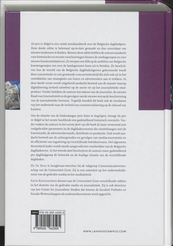 Het standaardwerk over de geschiedenis en de meest recente ontwikkelingen van de pers.De pers in België is het standaardwerk over de Belgische dagbladpers en het is uniek als volledig overzicht. Deze derde editie is helemaal up-to-date gemaakt en dus onmisbaar om nieuwe tendensen te duiden: verschuivingen binnen de mediagroepen, ambities van Belgische krantengroepen om over de landsgrenzen heen uit te breiden, strategieën om lezers en adverteerders te lokken, nieuwe kranteninitiatieven, een toenemende concurrentiestrijd, de uitbreiding van de online-activiteiten en de overschakeling naar het tabloidformaat. Ook de journalistieke praktijk, de Nieuwe Raad voor Journalistiek en de gevolgen van de nieuwe wet op de bescherming van de journalistieke bronnen krijgen in deze editie meer aandacht. En resultaten van onderzoek over inhoudelijke trends bij dagbladen komen uitgebreider aan bod. Om de situatie van de hedendaagse pers beter te begrijpen, brengt het boek in een eerste deel een volledig historisch overzicht. Verder maken de auteurs de lezer vertrouwd met de typische dagbladeconomie: de achtergronden en gevolgen van mediaconcentratie, de inkomsten- en kostenstructuur van dagbladen, een analyse van de lezers- en van de reclamemarkt, de distributie, de digitale ontwikkelingen, de positie van journalisten en de werking van redacties, trends in inhoud en vorm, zin en onzin van steunmaatregelen. Deze hoofdstukken schetsen een algemeen theoretisch kader waarbij steeds naar voorbeelden van de Belgische dagbladsector verwezen wordt. In het tweede deel brengen de auteurs het meer gedetailleerde levensverhaal van de verschillende dagbladen.