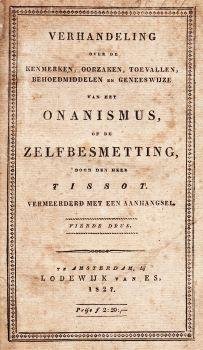Amsterdam, Lodewijk van Es, 1827. Original flexible printed boards. (2), xxviii, 270, (2) p. Uncut. Revised and extended 4th edition. Cover repaired, location numbers, some foxing. First published in Latin in 1758 (Tentamen de morbis ex manustupratione), this book by a Swiss medical doctor had an enormous influence on the perception of masturbation in the 18th century. A German and a French translation soon followed, and the first Dutch one in 1771. Tissot's teaching was based on the 'humours' that should be in balance. The humoral theory (from Latin 'humor' and Greek 'chymos', meaning 'juice'), which was already in use at the time of the ancient Greeks and in an ever-renewed form also dominated the Middle Ages and the Modern era. It only fell into disuse definitively in the second half of the 19th century. An uncontrolled ejectment of the wrong fluids, Tissot supposed to be the cause of all sorts of ailments. Fatigue, lethargy and early death are commonly observed symptoms.
