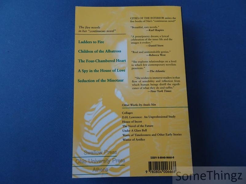 Ladders to Fire, Children of the Albatross, The Four-Chambered Heart, A Spy in the House of Love, Seduction of the Minotaur. Haunting and hypnotic, these five novels by Anaïs Nin began in 1946 to appear in quiet succession. Though published separately over the next fifteen years, the five were conceived as a continuous experience-a continuous novel like Proust's, real and flowing as a river. The full impact of Anaïs Nin's genius is only to be found through reading the novels in context and in succession. They form a rich, luminous tapestry whose overall theme Nin has called "woman at war with herself." Characters, symbols appear and reappear: now one, now another unfolding, gradually revealing, changing, struggling, growing, and Nin had forged an evocative language all her own for the telling. "The diary taught me that there were no neat ends to novels, no neat denouement, no neat synthesis," she explains. "So I began an endless novel, a novel in which the climaxes consisted of discoveries in awareness, each step in awareness becoming a stage in the growth like the layers in trees." Cities of the Interior fulfills a long-time desire on the part of readers, publisher, and Anaïs Nin herself to reunite the five novels in a single volume.
