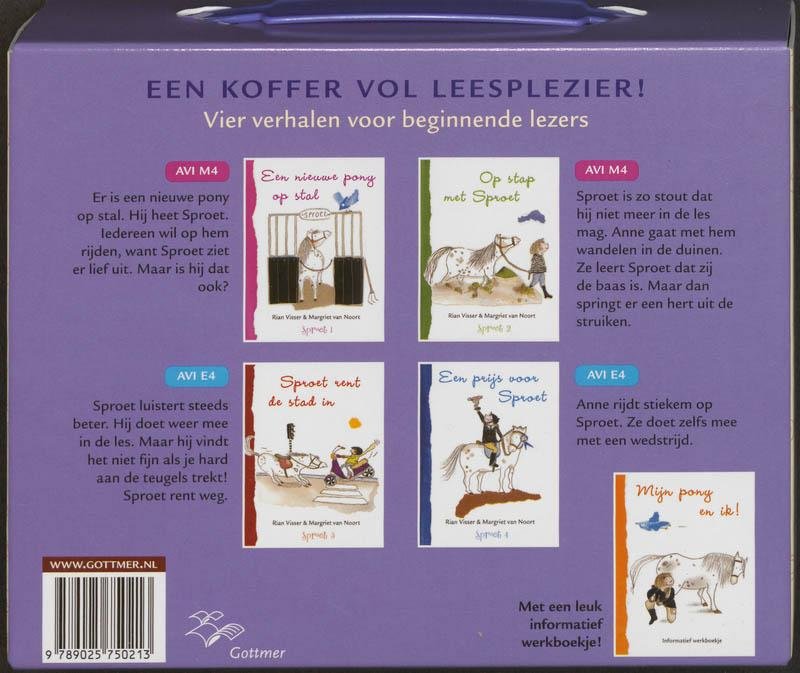 Het concept van de Gottmer-leeskoffertjes, waarin verschillende gebonden boekjes zitten van oplopend leesniveau, slaat aan. Inmiddels zijn er al 30.000 van verkocht! De vier gebonden boekjes in dit koffertje hebben een ijzersterk onderwerp: pony's, paarden en paardrijles. Met maar liefst 128 bladzijden leesplezier zullen kinderen in groep 3 en 4 urenlang genieten van de spannende verhalen over Sproet, een nieuwe pony in de manege, en Anne, die zo dolgraag op paardrijles wil maar niet mag van haar moeder. Daarbij zal hun zelfvertrouwen een enorme oppepper krijgen als blijkt dat ze al een hele serie kunnen lezen. In het koffertje zit bovendien een informatief boekje waarin de beginnende paardenliefhebbers van alles te weten komen over hun favoriete dier.