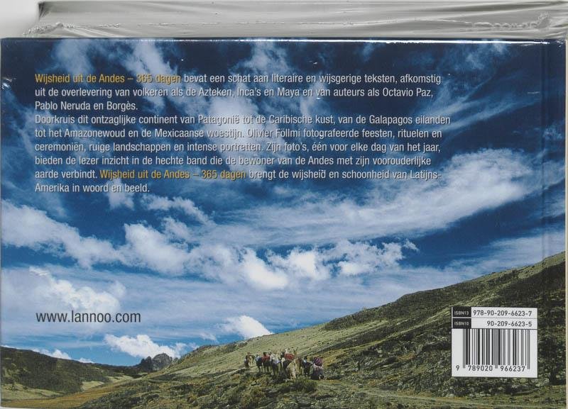 Nieuw deel in de succesvolle reeks 365 dagen Pakkende beelden en teksten voor elke dag van het jaar Teksten afkomstig van grote auteurs en filosofen als Octavio Paz, Pablo Neruda, Jorge Luis Borges, Miguel Angel Asturias Foto's uit Peru, Chili, Brazilië, Mexico, Guatemala, Bolivia, Argentinië, Colombia, Panama en Ecuador Wijsheid uit de Andes - 365 dagen bevat een schat aan literaire en wijsgerige teksten, afkomstig uit de overlevering van volkeren als de Azteken, Inca, Maya en Puebla en van auteurs als Octavio Paz, Pablo Neruda en Borgès. Doorkruis dit ontzaglijke continent van Patagonië tot de Caribische kust, van de Galapagos eilanden tot het Amazonewoud en de Mexicaanse woestijn. Olivier Föllmi fotografeerde feesten, rituelen en ceremoniën, ruige landschappen en intense portretten. Zijn foto's, één voor elke dag van het jaar, bieden de lezer inzicht in de hechte band die de bewoner van de Andes met zijn voorouderlijke aarde verbindt. Wijsheid uit de Andes - 365 dagen brengt de wijsheid en schoonheid van Latijns-Amerika in woord en beeld.