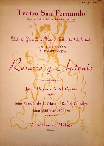 | Titel: | [Programmheft] Teatro San Fernando. Rosario y Antonio con la colaboración de Julián Perera - Angel Currás pianistas, Juan García de la Mata, Rafael Nogales, Juan Antonio Agüero guitaristas, Victoriano de Málaga cantaor Divadelní casopis / ... |