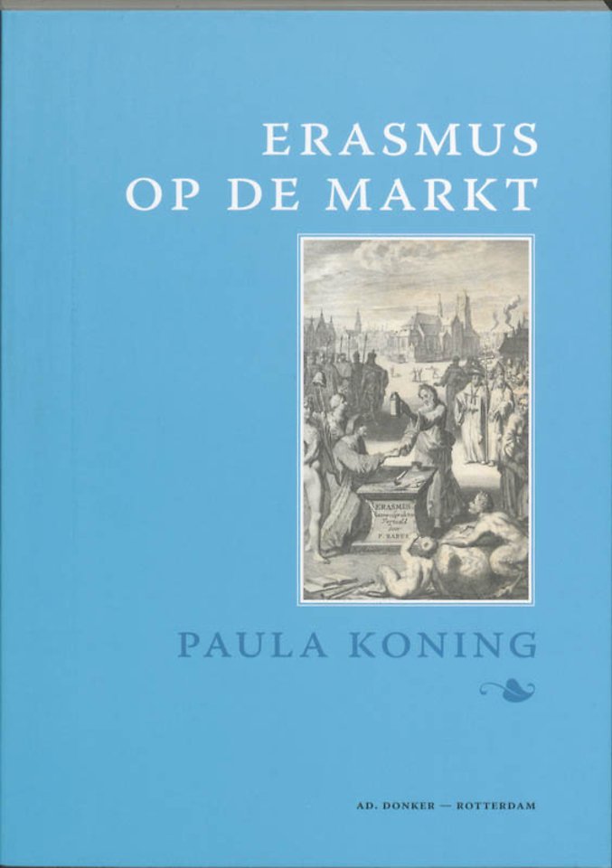Erasmus op de markt is een interessante verzameling boekillustraties uit de zeventiende en achttiende eeuw in uitgaven van de werken van Erasmus. Tientallen geïllustreerde titelpagina¿s tonen Erasmus te midden van vrienden en vijanden; personages uit zijn boeken en tal van symbolische figuren en attributen. Deze onverwachte beeldenschat in de kluis van de Bibliotheek Rotterdam wordt door Paula Koning (neerlandica) zorgvuldig geanalyseerd en beschreven. Dank zij haar gedegen bronnenonderzoek en nieuwe vondsten is dit niet alleen een boek voor Erasmus specialisten maar ook en vooral voor geïnteresseerde leken, want op luchtige wijze beschreven mag dit boek als een enorme aanwinst worden beschouwd. Dit boek belicht vanuit een nieuw perspectief en met niet eerder bestudeerd materiaal Erasmus in de zeventiende eeuw en ontsluit een deel van de drukgrafiek in de collectie Erasmiana in de Bibliotheek Rotterdam en is mede door het uitgangspunt ¿titelpagina-illustraties¿ voor een groot publiek z