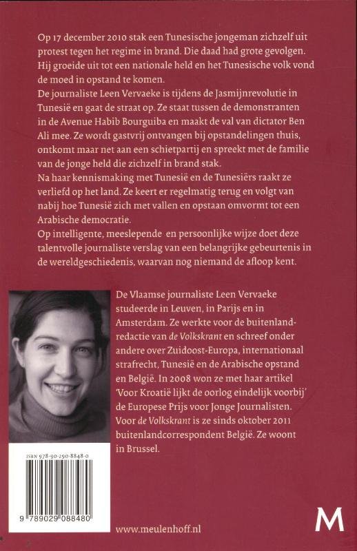 Op 17 december 2010 stak een Tunesische jongeman zichzelf uit protest tegen het regime in brand. Die daad had grote gevolgen. Hij groeide uit tot een nationale held en het Tunesische volk vond de moed in opstand te komen. President Ben Ali weigerde af te treden, waardoor het protest alleen maar groeide. De sociale media en de slechte economische omstandigheden wakkerden het vuur aan. De vlam sloeg over naar andere Arabische landen en de rest is geschiedenis. Leen Vervaeke is tijdens het begin van de Arabische revolutie in Tunesië en gaat de straat op. Ze staat tussen de rebellen en spreekt met de inwoners die het regime omverwerpen. Daarna reist Vervaeke nog enkele malen naar Tunesië om ook het verdere verloop van dichtbij mee te maken, o.a. om de verkiezingen mee te maken in oktober 2011. Op intelligente, meeslepende en persoonlijke wijze doet deze talentvolle journaliste verslag van een belangrijke gebeurtenis in de wereldgeschiedenis, waarvan nog niemand de afloop kent. Leen Vervaeke schreef in de Volkskrant meerdere artikelen over de opstand in Tunesië. Dit vormde de basis van De Jasmijnrevolutie.