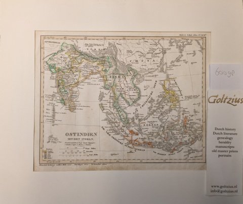 Map of Southeast Asia, including: Hindustan, Ceylon, Birma, Siam, Anam, Malacca, China, Philippines, Sumatra, Borneo, Java, Celebes, Moluccas. No. XVIIb from: Stieler's Schul-Atlas, Gotha: Justus Perthes Verlag, [ca. 1835], hand coloured engraving on laid paper, 206 x 262 cm, soiling in lower margin, water stain lower right.