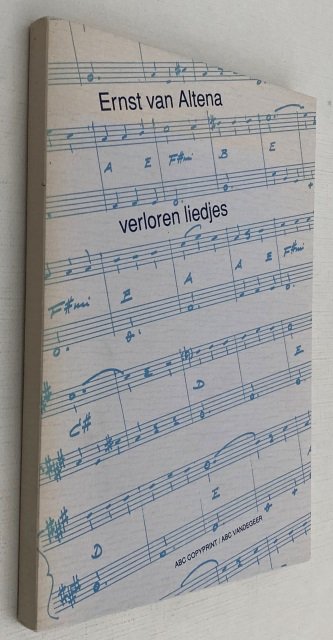 | Bijzonderheden: | 20,5x14 cm. Softcover, stofomslag (z.l.verschoten). 114 pp., bloemlezing uit liedteksten van Ernst van Altena, beperkte, genummerde oplage 500 ex., relatiegeschenk firma ABC Copyprint/ ABC Vandegeer, |