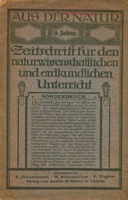 | Bijzonderheden: | Geklammert, seite 719 - 729 pp. Zeitschrift für den Naturwissenschaftlichen und erdkundlichen Unterricht. 9. Jahrg. Sonderdruck. Name auf Schutzumschlag. Herausgegeben von P. Johannesson, W. Schoenichen, P. Wagner. Schutzumschlag Verblaßt und A... |