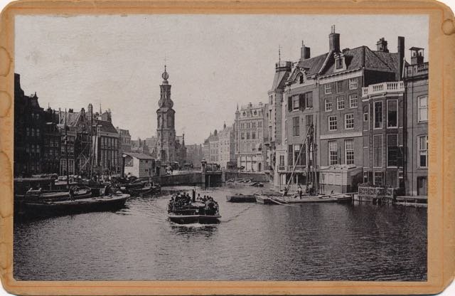 | Titel: | Gekartonneerde Foto Amstel gezien van Halvemaansbrug naar Muntplein |