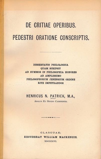 Henricus N. Patrick, M.A - De Critiae Operibus. Pedestri oratione conscriptis. Dissertatio philologica quam scripsit ad summos in philosophia honores ab amplissimo philosophorum jenensium ordine rite impetrandos