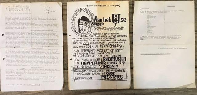 Uitgever: 3 enkelzijdig gestencilde pamfletten: Boodschap aan het Amsterdamsche provotariaat, 5 mei 1966; Oproep aan het XXXse Provotariaat Provotarische ex-cursie langs de oude meesters Rijksmuseum (No date - perforated holes showing); Oproep aan Amsterdam...