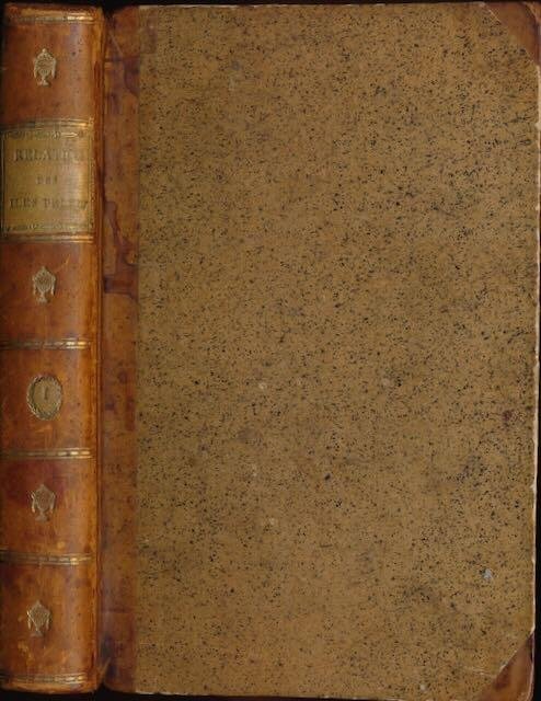 | Bijzonderheden: | Tome premier. Relié demi-cuir, 282 pp., traduit de L'Anglois de George Keate, avec errata, 5 dépliantes (vues, outils, et une carte: "carte des sles pelew et autres adjacents"), 2 portraits, 12x20x2,5 cm, carte en petit partie déchirée, traces... |