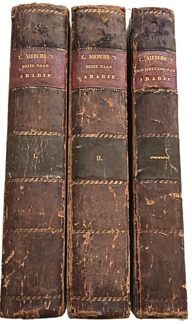 1. Reize: Amsterdam, S.J. Baalde; Utrecht, J. van Schoonhoven & co & B. Wild, 1776-1780. Illustrated with 2 engraved title pages and 125 beautifully engraved plates numbered I-LXXII, [LXXIII] (vol. 1) & I-LII (vol. 2), of which 38 folding, showing topographic views, watermills, people and costumes, Egyptian and Persian antiquities, Egyptian (hieroglyphic), Persian, cuneiform and other inscriptions, etc. Unnumbered folding map of Yemen at the end of vol. 1 (48,5 x 41,5 cm) with trade routes coloured by hand. \n\n2. Beschryving: Amsterdam, S.J. Baalde; Utrecht, J. van Schoonhoven & co, 1774. Illustrated with engraved title page and 25 finely engraved plates numbered I-XXIV, [XXV], of which 7 folding, showing a view of military exercises, 2 Kufic inscriptions (coloured by hand) and 4 maps, other plates showing maps, topographic views, costumes, coins and Arabic inscriptions. Unnumbered folding map of Yemen at the end (58,5 x 39 cm) coloured by hand in outline. Binding slightly rubbed, inner hinge of vol. 2 loose, otherwise good. Half titles sligthly thumbed, minor foxing in blank margins. Very good large paper copy, only slightly trimmed.\n\n# Very rare large paper copies of the first and only editions of the Dutch translation of Niebuhr’s famous account of a voyage to Arabia and surrounding countries (1. Reize) and his description of Arabia, Egypt, Persia and the Middle East (2. Beschryving). The Danish traveller and surveyor Carsten Niebuhr (1733-1815) was invited to join a scientific expedition to Egypt in 1760. They travelled Yemen, Mocha, India, Bombay, Muscat, Shiraz, Babylon, Bahdad, Mosul, Aleppo, Persepolis, Mekka, Medina, and Palestine, before finally returning to Copenhagen in 1767, with Niebuhr as the sole survivor of the expedition.\nRef. Tiele, 795f (doesn’t mention copies on large paper). Cf. Atabey 873f. Cox I, 237f. Gay 3589.