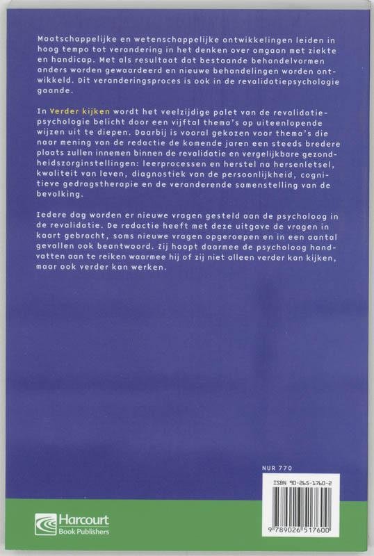 Maatschappelijke en wetenschappelijke ontwikkelingen leiden in hoog tempo tot verandering in het denken over omgaan met ziekte en handicap. Met als resultaat dat bestaande behandelvormen anders worden gewaardeerd en nieuwe behandelingen worden ontwikkeld. Dit veranderingsproces is ook in de revalidatiepsychologie gaande. In 'Verder kijken' wordt het veelzijdige palet van de revalidatiepsychologie belicht door een vijftal thema's op uiteenlopende wijzen uit te diepen. Daarbij is vooral gekozen voor thema's die naar mening van de redactie de komende jaren een steeds bredere plaats zullen innemen binnen de revalidatie en vergelijkbare gezondheidszorginstellingen: leerprocessen en herstel na hersenletsel, kwaliteit van leven, diagnostiek van de persoonlijkheid, cognitieve gedragstherapie en de veranderende samenstelling van de bevolking. Iedere dag worden er nieuwe vragen gesteld aan de psycholoog in de revalidatie. De redactie heeft met deze uitgave de vragen in kaart gebracht, soms nieuwe vragen opgeroepen en in een aantal gevallen ook beantwoord. Zij hoopt daarmee de psycholoog handvatten aan te reiken waarmee hij of zij niet alleen verder kan kijken, maar ook verder kan werken.