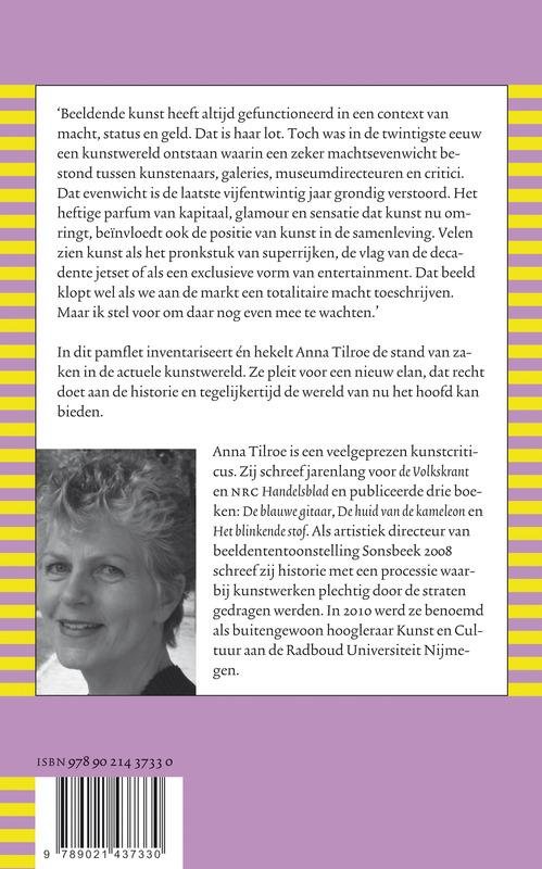 Vrijwel niemand gelooft meer dat beeldende kunst werkelijk gewicht heeft in de samenleving. Ze speelt geen enkele rol meer in het maatschappelijk debat over hoe wij willen zijn en over de wereld waarin wij willen leven. Scepsis en academisme hebben de plaats ingenomen van de moed om met de middelen van de kunst het grootse te denken. Om werkelijke veranderingen voor te stellen en wat waardevol is te bevechten. Hoe heeft hetzo ver kunnen komen? Is er nog hoop dat de kunst weer een invloedrijke stem krijgt? Anna Tilroe analyseert het conservatisme en de clichés van de kunstwereld en bepleit een nieuw vitaal elan.