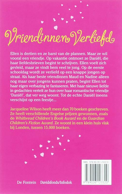 Vriendinnen verliefdEllen is dertien en ze barst van de plannen. Maar ze wil vooral een vriendje. Op vakantie ontmoet ze Daniël, die haar liefdesbrieven begint te schrijven. Ellen voelt zich gevleid, maar ze vindt hem veel te jong. Op de eerste schooldag wordt ze verliefd op een knappe jongen op straat. Als haar beste vriendinnen Maud en Nadine alleen nog maar over jongens kunnen praten, begint Ellen tot haar eigen verbazing te fantaseren. Met haar nieuwe liefde in gedachten vertelt ze hun over haar romantische vriendje 'Daniël', dat ver weg woont. Tot de echte Daniël ineens verschijnt op een feestje...Jacqeline Wilson heeft meer dan 70 boeken geschreven. Ze heeft verschillende Engelse prijzen gewonnen, zoals de Whitbread Childern's Book Award en de Guardian Children's Fiction Award. Ze woont in een klein huis valk bij Londen, tussen 15.000 boeken.