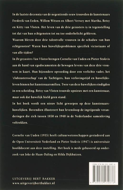 In de laatste decennia van de negentiende eeuw trouwden de kunstenaars Frederik van Eeden, Willem en Albert Verwey met Martha, Betsy en Kitty van Vloten. Het leven van de drie gezusters is in tegenstelling tot dat hun echtgenoten tot nu toe onderbelicht gebleven.Waarom bleven deze drie talentvolle in de schaduw van hun echtgenoten? Waren hun huwelijksproblemen specifiek victoriaans of van alle tijden?In De gezusters Van Vloten brengen Cornelie van Uuden en Pieter Stokvis aan de hand van egodocumenten de bewogen levens van deze drie vrouwen in kaart. Hun bijzondere opvoeding door een verlichte vader, het 'clubzustersschap' van de Tachtigers, hun verlovingstijd en huwelijks-leven binnen het kunstenaarsmilieu. Twee van deze huwelijken eindigden in een scheiding. Betsy van Vloten trouwde opnieuw met een kunstenaar, maar ook dat huwelijk hield geen stand.In het boek wordt een nieuw licht geworpen op deze kunstenaars-huwelijken. Bovendien illustreert hun levensloop de ingrijpende veranderingen die zich tussen 1850 en 1940 in de Nederlandse samenleving voltrokken.Cornelie van Uuden (1935) heeft cultuurwetenschappen gestudeerd aan de Open Universiteit Nederland en Pieter Stokvis (1947) is universitair hoofddocent aan deze instelling. Het boek is mede gebaseerd op onderzoek van Joke de Haan-Daling en Hilda Dijkhuizen.
