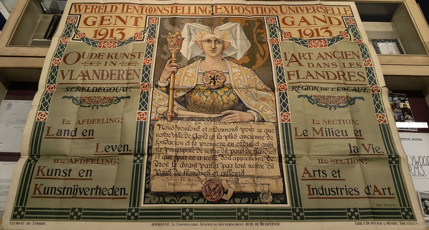 Originele affiche (lithografie) voor de wereldtentoonstelling Gent 1913 \"Oude kunst in Vlaanderen. Scheldegauw 1ste afdeeling Land en Leven - 2de afdeeling Kunst en Kunstnijverheden.\nOntwerp René De Cramer (Aalter, 1876 - Gent, 1951) \nDruk Etablissements Gouweloos, Frère et Soeur, Rue Brogniez, 44, Bruxelles \nMooi exemplaar van deze grote en dus erg fragiele affiche. Opgeplooid dus met onherroepelijk her en der plooien een stukje doorgesleten