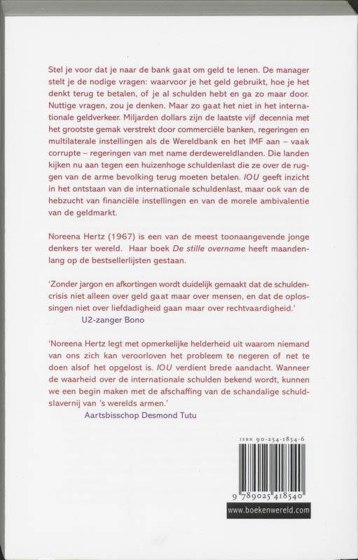 IOU geeft inzicht in het ontstaan van de internationale schuldenlast, maar ook van de hebzucht van financiële instellingen en van de morele ambivalentie van de geldmarkt. Rock in Washington ‘Ge zult het vijftigste jaar heiligen en vrijheid in het land afkondigen voor al zijn bewoners, een jubeljaar zal het voor u zijn, dan zal ieder van u tot zijn bezittingen en tot zijn geslacht terugkeren? Leviticus 25:10, zoals gedeeltelijk gegraveerd in de Vrijheidsklok in Philadelphia “Wie is hier de Elvis?’ vroeg de rocker ongeduldig. De vraag bleef hangen tussen de boeken die het kantoor van Leslie Gelb vulden, in het stijlvolle herenhuis waarin de Raad voor Buitenlandse Betrekkingen was gehuisvest. De geïrriteerde toon was die van een man die gewend was aan stadions vol fans die aan zijn lippen hingen om elk woord en elke zin op te vangen, maar het was allesbehalve een arrogante vraag. Gelb had net zijn privécollege over de Amerikaanse machtsstructuren afgerond, door de lange keten te schetsen — van David Rockefeller tot vNambassadeur Richard Holbrooke en de minister van Financiën Robert Rubin, tot de voormalige voorzitter van de Federal Reserve Paul Volcker tot een aantal vooraanstaande Republikeinen — waarlangs de invloed liep van Wall Street op Washington en omgekeerd. Gelbs doel was Bono duidelijk te maken dat hij nu op een heel ander soort podium probeerde op te treden. Paul McGuinness, de manager van U2, had hem nog maar kort tevoren gewaarschuwd dat het één ding was om binnen de muziekwereld voor kwijtschelding van schulden te lobbyen, maar dat het iets heel anders was die zaak door het Amerikaanse politieke proces te loodsen. Met die woorden nog luid en duidelijk in de oren, probeerde de rockzanger nueen kortere weg naar zijn doel te vinden. ‘Je weet dat ik gewoon een baan hebt’ vroeg Bono, half ironisch. Het was heel goed mogelijk dat de uitgesproken on-hippe Gelb geen idee had waarom de jongeman belangrijk was. Gelb was op dat moment voorzitter van de belangrijkste denktank op het gebied van buitenlands beleid in de Verenigde Staten — een gezelschap dat veel zelfingenomen bankiers, diplomaten, journalisten en vage geleerden ontving, maar geen gewone beroemdheden. Bono's protest had hoe dan ook geen enkel effect. Gelb boog zich naar Bono en herhaalde op raspende toon (hij had net zijn stem verloren) dat iedereen die hij zojuist genoemd had ‘kan tegenhouden dat dit idee ooit van de grond komt. En als Bono de Verenigde Staten echt zo ver wilde krijgen dat ze alle vorderingen op de armste landen van de wereld zouden schrappen, dan zou hij de steun nodig hebben van al die hoogwaardigheidbekleders. Om nog maar niet de spreken van zijn wens dat de vs middelen beschikbaar zouden stellen om de bedragen te dekken die deze landen verschuldigd waren aan de Wereldbank, het 1Mr en de regionale ontwikkelingsbanken. Gelb maakte hem duidelijk dat geen van deze figuren op zich genoeg overwicht had om zo'n ingewikkelde manoeuvre — die absoluut niet hoog op de politieke agenda stond — tot een goed einde te brengen. Kwijtschelding van schulden was een thema waar heel wat kanten aan zaten en waar vele partijen bij betrokken waren. Het organiseren van kwijtschelding door de Amerikaanse regering vereiste het soort unanimiteit die in het huidige gepolitiseerde klimaat zelden te vinden is. ‘Er is geen Elvis, antwoordde Gelb ten slotte en hij werkte de rockster resoluut de deur uit. Gelb had gelijk: er was geen Elvis en er was geen kortere weg. Uiteindelijk zou Paul Hewson, de Ierse zanger die net als Bono door miljoenen mensen werd aanbeden, dertig keer heen en weer reizen over de Atlantische Oceaan, en stapje voor stapje een coalitie opbouwen bestaande uit enkele van ’s werelds minst sentimentele politici. Na anderhalf jaar van smeken en vleien kreeg hij voor elkaar dat een twaalftal prominente Democraten en Republikeinen in het Congres en de regering-Clinton steun gaven aan een pakket dat voorzag in kwijtschelding van alle schulden aan de vs van de 33 armste landen van de wereld. Bovendien voorzag het in de betaling van een deel van wat deze landen de Wereldbank en het iMF schuldig waren. Het was het hoogtepunt van de eerste — en laatste — serieuze poging van gewone mensen in het Westen om politici te dwingen iets te doen aan de pijnlijke erfenis van de schulden van de Derde Wereld.