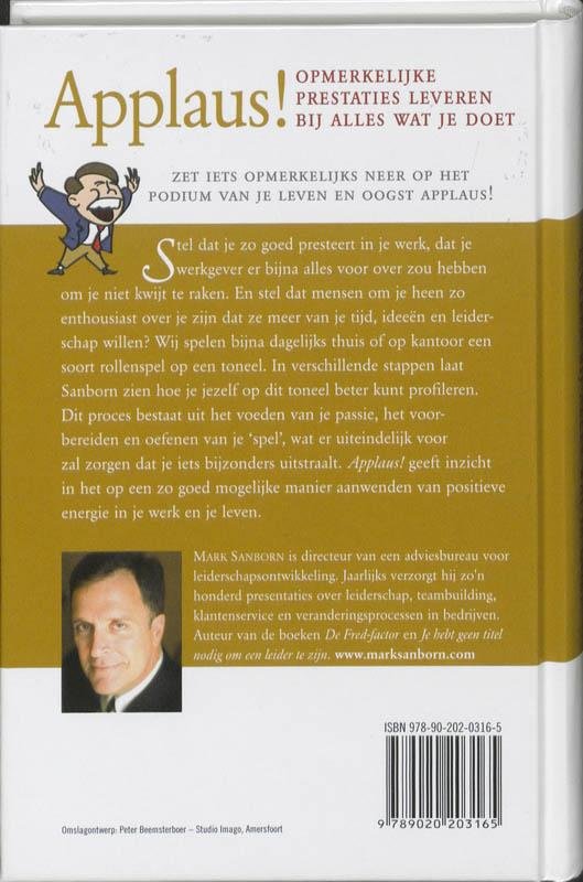Stel dat je zo goed presteert in je werk, dat je werkgever er bijna alles voor over zou hebben om je niet kwijt te raken. En stel dat mensen om je heen zo enthousiast over je zijn dat ze meer van je tijd, ideeën en leiderschap willen? Wij spelen bijna dagelijks thuis of op kantoor een soort rollenspel op een toneel. In verschillende stappen laat Sanborn zien hoe je jezelf op dit toneel beter kunt profileren. Dit proces bestaat uit het voeden van je passie, het voorbereiden en oefenen van je spel, wat er uiteindelijk voor zal zorgen dat je iets bijzonders uitstraalt. Applaus! geeft inzicht in het op een zo goed mogelijke manier aanwenden van positieve energie in je werk en je leven. Zet iets opmerkelijks neer op het podium van je leven en oogst applaus! Mark Sanborn is directeur van een adviesbureau voor leiderschapsontwikkeling. Jaarlijks verzorgt hij zon honderd presentaties over leiderschap, teambuilding, klantenservice en veranderingsprocessen in bedrijven. Auteur van de boeken De Fred-factor en Je hebt geen titel nodig om een leider te zijn. www.marksanborn.com