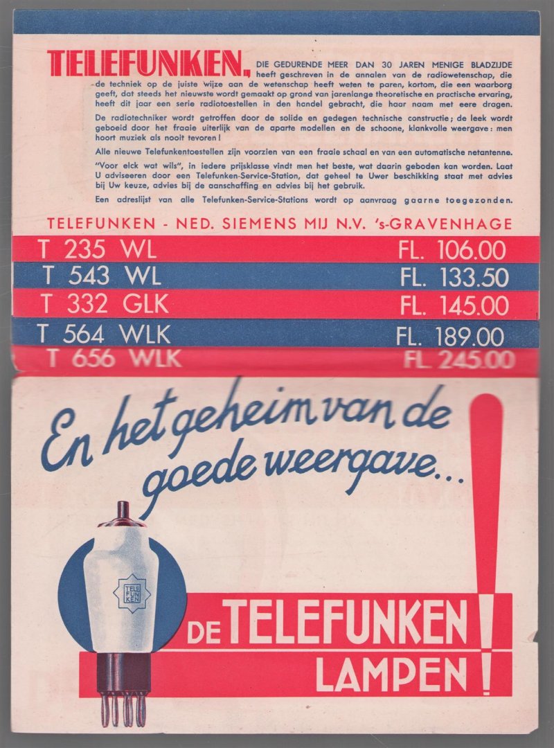 | Bijzonderheden: | c 1955, Zeer goed, Vult uw radioprogramma aan met TELEFUNKEN Gramafoonplaten - Men hoort ze telkens met meer genoegen Folder c. 20x14 Cm., Openslaand en met meerdere pag. Mooi exemplaar. Met diverse radio's afgebeeld en met prijzen. |