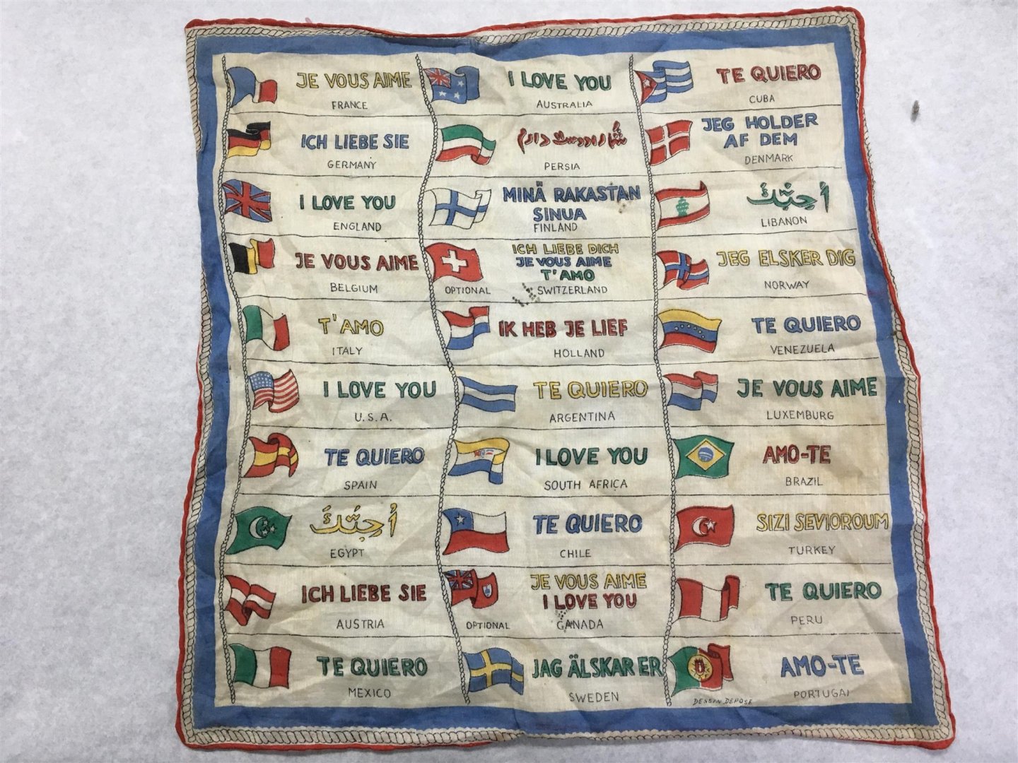 | Bijzonderheden: | c 1920, Zeer goed, Prachtige zijden ? doek met de tekst I lave you in 30 verschillende talen. Zeer kleurrijk. Extreem zeldzaam (was een vondst in een boek) circa 32x32 Cm. |
