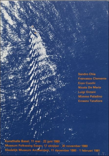 1st large international group exhibition of the Italian Transavanguardia: Kunsthalle Basel / Museum Folkwang Essen / Stedelijk Museum Amsterdam, 1980-1981. 7 individual catalogs, each designed by the artists themselves (in different sizes) and 1 additional catalog (52 pp.) in original cardboard box (22.5 : 16.2 cm). with illustrated title label. Edition of 900 copies. Catalog Sandro Chia. Paintings and drawings (with 53 illus.), Catalog Francesco Clemente. Adyar, Gennaio 1980. works on paper (with 24 color illus.), Catalog Enzo Cucchi. Eroe delle campagne marchigiane. Paintings and drawings (with 31 illus.), Catalog Nicola De Maria. Musica - Occhi (rooms, 12 double cards in cardboard box), Catalog Luigi Ontani, Catalog Mimmo Paladino. Pictures (with 11 color illustrations of rare early works!), Catalog Ernesto Tatafiore. Historia (Robespierre cycle) The additional catalog contains forewords and biographies of the artists as well as the translations of the texts and titles of the paintings that are found in the catalogs conceived and supervised by the artists themselves. Texts by J.-C.Ammann, Achille Bonito Oliva and Germano Celant. -