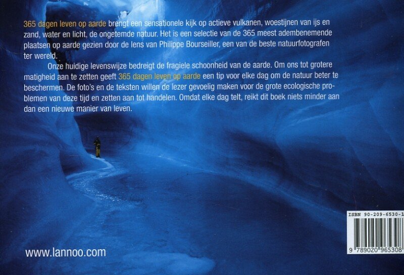 365 dagen leven op aarde brengt een sensationele kijk op actieve vulkanen, woestijnen van ijs en zand, water en licht, de ongetemde natuur. Het is een selectie van de 365 meest adembenemende plaatsen op aarde gezien door de lens van Philippe Bourseiller, een van de beste natuurfotografen ter wereld.Onze huidige levenswijze bedreigt de fragiele schoonheid van de aarde. Om ons tot grotere matigheid aan te zetten geeft 365 dagen leven op aarde een tip voor elke dag om de natuur beter te beschermen. De foto's en de teksten willen de lezer gevoelig maken voor de grote ecologische pro-blemen van deze tijd en zetten aan tot handelen. Omdat elke dag telt, reikt dit boek niets minder aan dan een nieuwe manier van leven.