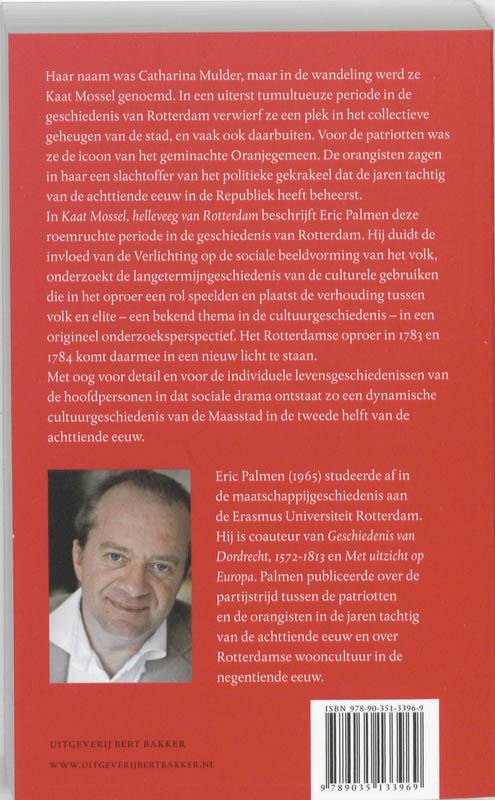 Haar naam was Catharina Mulder, maar in de wandeling werd ze Kaat Mossel genoemd. In een uiterst tumultueuze periode in de geschiedenis van Rotterdam verwierf ze een plek in het collectieve geheugen van de stad, en ook vaak daarbuiten. Voor de patriotten was ze de icoon van het geminachte Oranjegemeen. De orangisten zagen in haar een slachtoffer van het politieke gekrakeel dat de jaren tachtig van de achttiende eeuw in de Republiek heeft beheerst. In Kaat Mossel, helleveeg van Rotterdam beschrijft Eric Palmen deze roemruchte periode in de geschiedenis van Rotterdam. Hij duidt de invloed van de Verlichting op de sociale beeldvorming van het volk, onderzoekt de lange termijngeschiedenis van de culturele gebruiken die in het oproer een rol speelden en plaatst de verhouding tussen volk en elite - een bekend thema in de cultuurgeschiedenis - in een origineel onderzoeksperspectief. Het Rotterdamse oproer in 1783 en 1784 komt daarmee in een nieuw licht te staan. Met oog voor detail en voor de individuele levensgeschiedenissen van de hoofdpersonen in dat sociale drama ontstaat zo een dynamische cultuurgeschiedenis van de Maasstads in de tweede helft van de achttiende eeuw.