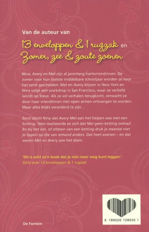 Van de auteur van 13 enveloppen & 1 rugzak en Zomer, zee & zoute zoenenNina, Avery en Mel zijn al jarenlang hartsvriendinnen. De zomer voor hun laatste middelbare schooljaar worden ze voor het eerst gescheiden: Mel en Avery blijven in New York en Nina volgt een workshop in San Francisco, waar ze verliefd wordt op Steve. Als ze vol verhalen terugkomt, verwacht ze door haar vriendinnen met open armen ontvangen te worden. Maar alles blijkt veranderd te zijn...Eerst dacht Nina dat Avery Mel aan het helpen was met een ketting. Toen realiseerde ze zich dat Mel geen ketting omhad. En bij het om- of afdoen van een ketting druk je meestal niet je lippen op die van iemand anders. Dat heet zoenen - en dat waren Mel en Avery aan het doen.'Dit is echt zo'n boek dat je niet meer weg kunt leggen.' Girlz over 13 enveloppen & 1 rugzak