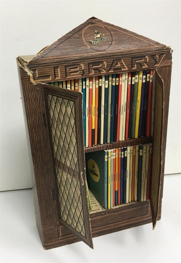 | Bijzonderheden: | c 1970 ?, Zie beschrijving, Kartonnen bibliotheek kast c. 17,5x24,5x6 Cm (zonder uitsteeksels) met 52 miniatuur boekjes (ook veel doubletten zie afbeeldingen) Geleefd - opbouw / uitsteeksels omgevouwen.; Voor meer afbeeldingen kijk op www.boekned.nl |