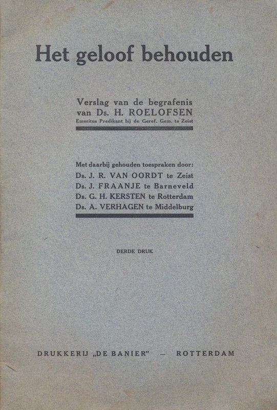 Het geloof behouden, verslag van de begrafenis van ds. H. Roelofsen, emeritus Predikant bij de Geref. Gem. te Zeist. Met daarbij gehouden toespraken door ds. J.R. van Oordt, ds. J. Fraanje, ds. G.H. Kersten en ds. A. Verhagen. Met portret van ds. H. Roelofsen. |