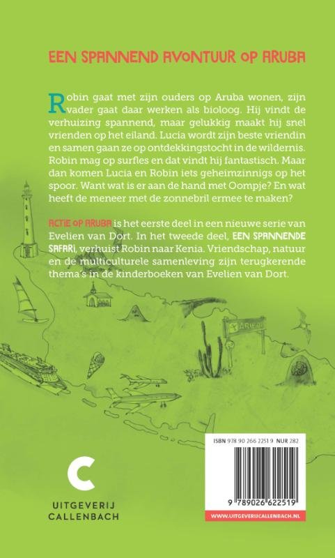 'Actie op Aruba' is het eerste deel in de serie 'Robins reisavonturen' van Evelien van Dort. Robin is een ondernemende en gevoelige jongen van negen jaar. Hij verhuist met zijn ouders naar Aruba, een eiland midden in de oceaan. Zijn moeder gaat op een school werken, zijn vader is bioloog en doet onderzoek naar zeldzame planten. Robin gaat naar een nieuwe school en maakt snel vrienden. Lucia wordt zijn beste vriendin en samen ontdekken ze het eiland. Op Aruba zijn veel bijzondere dieren, zoals leguanen, slangen en pelikanen. En dan ontdekt Robin een geheim, kan Lucia hem helpen om dit raadsel op te lossen? In het tweede deel van deze serie, 'Een spannende safari', gaat Robin met zijn ouders naar Kenia. Evelien van Dort schreef eerder de succesvolle series 'Funny' en 'Sanne @ Sanne'.